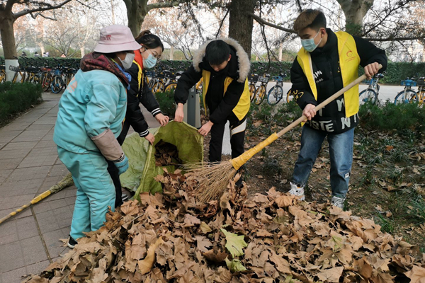 活动的第一项内容为“学生骨干校园清扫落叶行动”。上午九点,各二级学院的学生骨干在青年志愿者联合会的带领下前往清扫区域,志愿者们不惧寒冷,分工合作,默契配合,很快就完成了清扫工作。