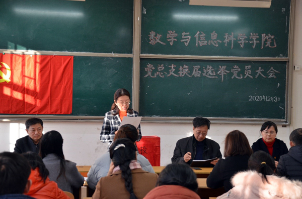 大会严格按照《中国共产党章程》、《中国共产党基层组织选举工作暂行条例》、学校党委《部分党组织换届选举工作方案》,采取无记名投票和差额选举的办法,选举产生了新一届党总支委员会委员5名。随后,新一届党总支委员会委员召开了第一次会议,选举周莹同志为数学与信息科学学院党总支书记,籍法俊、郑栋鹏同志为数学与信息科学学院党总支副书记,并讨论确定了委员工作分工。