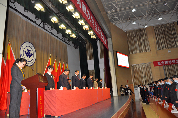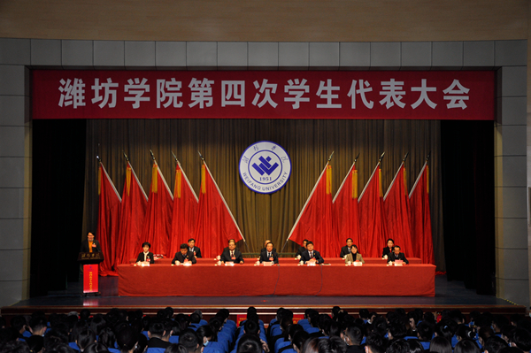 本网讯 12月13日,潍坊学院第四次学生代表大会在图书馆报告厅召开。学校党委书记李东、校长冯滨鲁、党委副书记王清明、副校长丁子信、潍坊团市委书记赵中国、潍坊团市委学少部部长王海燕出席开幕式。学校有关部门负责同志,各学院党总支书记、副书记,各学院团总支书记、副书记应邀出席开幕式。大会正式代表、列席代表和部分学生,共计300余人参加了大会。