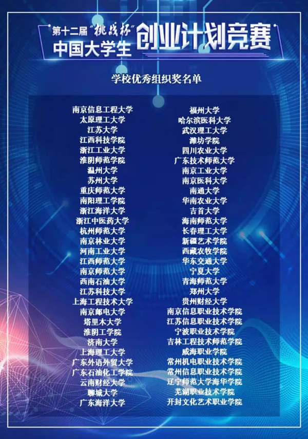 本网讯 12月14日,第十二届“挑战杯”中国大学生创业计划竞赛组织奖、活动组织奖名单公布,我校荣获全国“学校优秀组织奖”,全国共60所大中专院校获此殊荣,山东省仅4所;同时孙玉凤同学荣获“畅想2050”全国优秀视频作品奖。