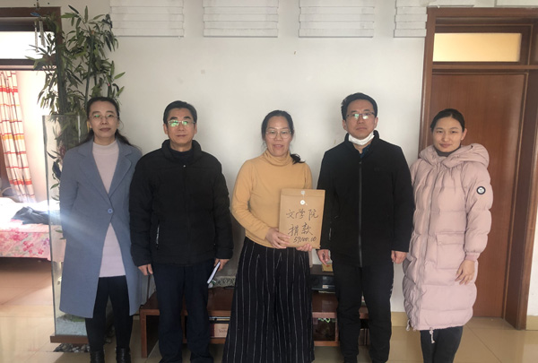 本网讯 12月17日,文学与新闻传播学院的领导和教师代表,冒着严寒,来到已故教师郭荣波家中,为遗属送去温暖,把59100元捐款送到了郭老师家属手中。