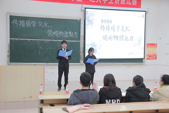 本网讯 为了让同学们体会传统文化中的物理现象和物理故事,践行社会主义核心价值观,弘扬优秀传统文化,12月17日,物理与光电工程学院举办“传播国学文化,领略物理魅力”大学生讲课比赛。四位老师、两位学生代表担任评委,15个团队的同学参加比赛。