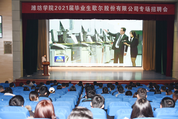 本网讯 12月28日,2021届毕业生歌尔股份有限公司专场招聘会在潍坊学院图书馆报告厅举行,各学院200余名毕业生了参加本次宣讲会。