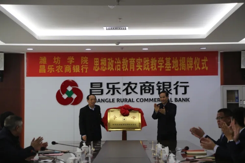 会上,副校长丁子信就学校和实践实训基地建设情况作了简单介绍,昌乐农商银行党委书记、董事长王家厚就昌乐农商银行情况进行了介绍,并对基地落户昌乐农商银行表示欢迎和支持,双方签署了《潍坊学院思想政治教育实践教学基地协议书》,昌乐县委常委、政法委书记王秀刚和丁子信为基地揭牌。