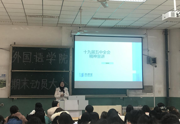 本网讯 1月4日上午,外国语学院党总支副书记刘希美以“强化就业优先政策,促进高质量就业”为题, 为学院2017级全体同学作党的十九届五中全会精神宣讲报告。
