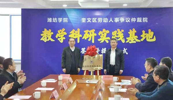 法学院与奎文区人社局负责同志代表双方签订了《潍坊学院教学科研实践基地协议书》。丁子信和侯法强为“潍坊学院教学科研实践基地”揭牌。参加仪式人员到奎文区劳动人事争议仲裁院进行现场观摩。