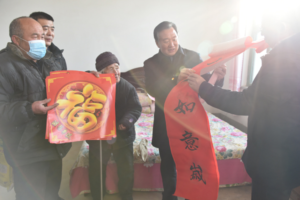 30日上午,李东一行分别到博平镇辛庄村、张岳村和肖庄镇朱楼村、王菜瓜村走访慰问。每到一处,李东都与镇村干部进行交流,了解村庄基本情况,征求镇村对帮扶工作的意见建议。李东一行为生活困难群众带来了米、面、食用油等慰问品,并亲手送上潍坊学院师生写的春联、福字,向他们表达新春的祝福,祝愿他们身体健康、生活越来越美好。