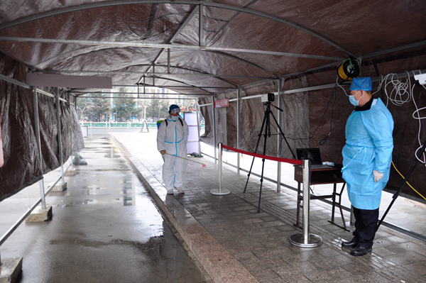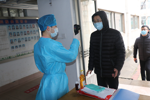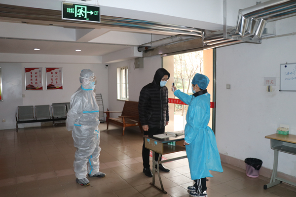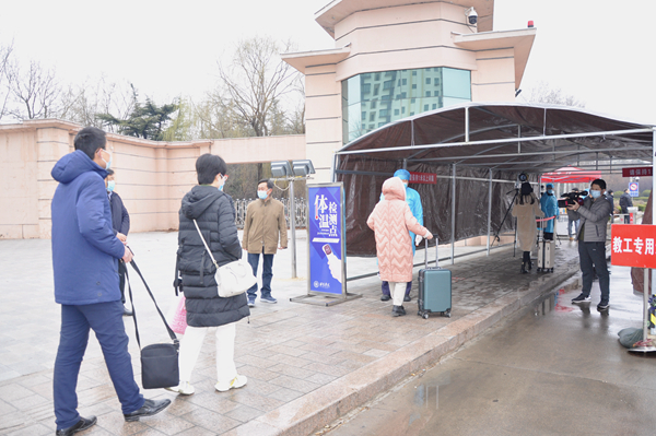 在学校南大门返校报到入口处,学生戴口罩间隔1米排队入校,依次经过测量体温、查验健康码、学生证进入校园。体温异常的学生经过初步筛查,启动应急处置程序。设立的体温检测双通道、临时留观点,既保证了入校秩序,又确保了师生健康安全。本环节着重演练了体温异常学生返校的应急处置程序。