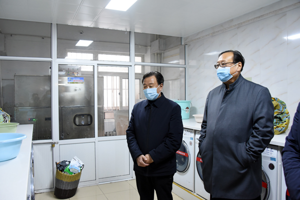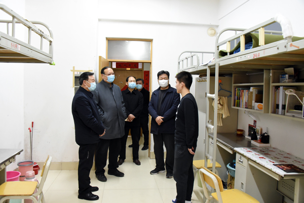 在学生宿舍,校领导查看了环境卫生、洗衣间和浴室等生活配套设施使用情况、看望了部分返校学子。在弘德书院11号公寓,校领导与法学院20级学生张政亲切交谈,关切的询问学生返校路程、交通方式、过年和假期生活,叮嘱他要做好个人防护、搞好宿舍卫生、调整身心状态、尽快投入校园学习生活状态。