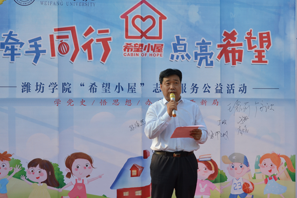 王清明在讲话中指出,“希望小屋”儿童帮扶关爱项目,是团省委牵头组织的重点项目,是山东希望工程转型升级的重要突破,是助力脱贫攻坚、全面小康的有力抓手。自2020年,全省启动“希望小屋”儿童帮扶关爱项目以来,学校党委高度重视,学校团委认真组织、主动担当,开展了线上“99公益日”募捐和线下宣传发动,全校师生为“希望小屋”募捐4.6万元,目前正在对接建设以潍坊学院命名的“希望小屋”。王清明强调,学校举办“希望小屋”志愿服务公益活动,是贯彻落实学校党委党史学习教育要求,也是学校主动融入社会发展大局,服务潍坊高品质城市建设发展,扎实为潍坊青少年办实事的重要举措。全校广大师生要高度重视,提高认识,全校各级共青团和学生会,要切实发挥组织优势,动员广大青年师生积极行动起来,动员团支部、社团和青年志愿服务团队行动起来,广泛凝聚潍院师生的爱心力量,积极响应,踊跃参与,为呵护困境儿童成长,做出实实在在贡献,在脱贫攻坚、全面小康中,展现青春担当,为“潍坊学院希望小屋”建设增砖添瓦。