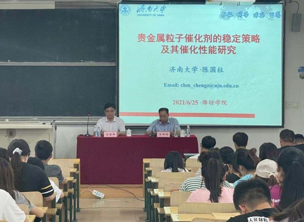 本网讯 6月25日下午,应化学化工与环境工程学院邀请,济南大学化学化工学院副院长陈国柱教授在人合楼为化院近200名师生作了题为《贵金属粒子催化剂的稳定策略及其催化性能研究》的学术报告。院长王林同主持学术报告会。