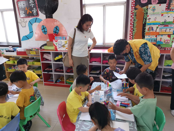 本网讯 为丰富社区内少年儿童的文化生活,提高孩子们的艺术修养,6月28日下午,美术学院学生党支部、教工第一党支部、第二党支部的师生一行12人来到工福街社区幼儿园,发挥自己的绘画特长,热心教小朋友们绘画。