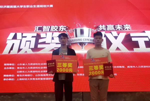 本网讯 6月25日,“胶东经济圈首届大学生职业生涯规划大赛”颁奖仪式在青岛举行。计算机工程学院2018级计算机科学与技术(软件外包)专业朱萧龙、董昭帅同学荣获本研组三等奖。此外,朱萧龙同学还荣获本研组最佳助演团队奖;董昭帅同学因专业能力突出,被烟台市东方威思顿电器有限公司现场邀约毕业后到该公司工作。