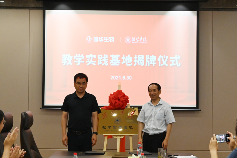 座谈会上,双方就合作进行生物、化学、制药工程、市场营销和国际贸易等专业的人才培养、教师互派、项目合作等事项达成了一致意见。经济管理学院的市场营销教学团队与康华公司的营销管理团队进行了深入沟通,双方商定联合开展营销人员培训、开展生物医药行业营销模式研究。经济管理学院刘鹏院长代表相关学院与该公司签订了共建教学实践基地协议,丁子信与杨致亭为“潍坊学院教学基地”揭牌。