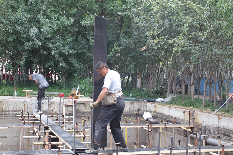 受台风影响,潍坊近日时常阴雨绵绵。7月28日上午,记者跟随总务处张东国科长来到宏泰物业工人施工场地。工人们正在为裸露的土地铺设草皮和种草,不知是雨水还是汗水所致,他们的衣衫早已湿透。“做好校园绿化美化,主要是为了优化工作与学习环境,增强师生的幸福感。同时也为70周年校庆营造出生机勃勃的氛围。之前我们刚刚完成了对‘世纪风’雕塑的翻新维护。”张科长说道。步履不停,我们冒着霏霏小雨来到了中水厂的作业现场。中水厂是潍院节水校园建设的标杆之作, 8月底之前要完成对中水厂的升级改造,包括更替原来由铁板组成的防水盖为混凝土材质的防水盖;过滤系统加以升级,使废水可以得到更进一步的利用等。天空还飘着细雨,张科长在群内接到消息:6号楼自来水管爆裂。连忙赶到现场察看,只见工人们正努力抢修。“这个操作起来也不难,就是麻烦点儿,要把这些水先提出来,然后才能进行水管的修缮。”穿着深深的雨鞋的工人告诉记者。