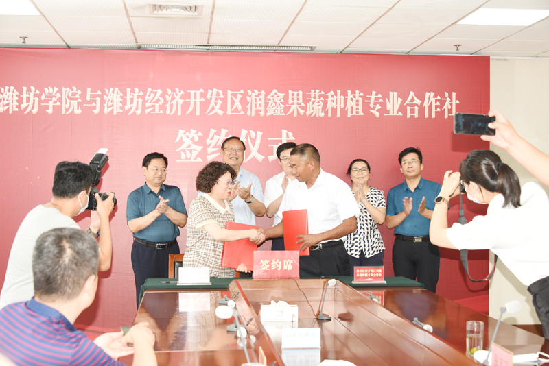 本网讯 8月10日,我校与潍坊经济开发区润鑫果蔬种植专业合作社校企合作签约揭牌仪式,在潍坊经济开发区机关办公大楼举行。校长冯滨鲁,潍坊经济开发区领导乔日升、王永刚出席仪式。学校发展规划处、科研处、生物与农业工程学院负责同志,潍坊市农业农村局、潍坊经济开发区相关负责同志参加仪式。