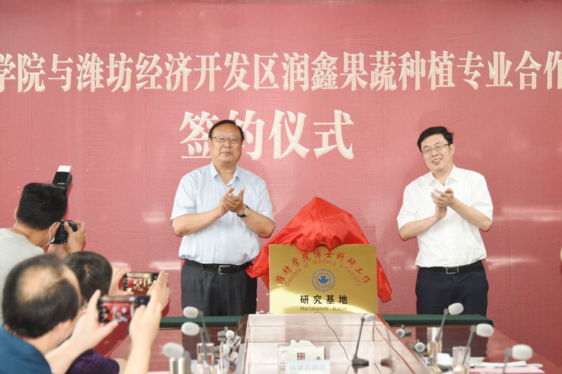 仪式上,生物与农业工程学院院长曹慧与润鑫果蔬专业合作社副理事长孙好欣签订校企合作协议,冯滨鲁、乔日升共同为潍坊学院博士科研工作研究基地揭牌。