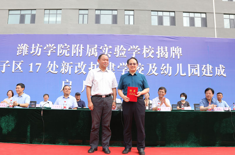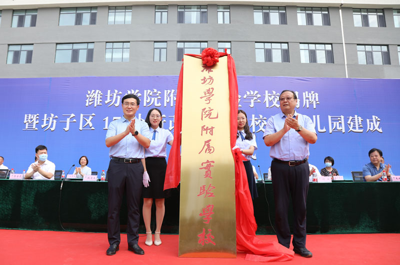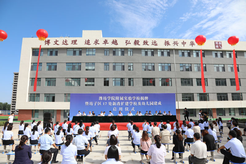本网讯 8月26日,潍坊学院附属实验学校揭牌暨坊子区17处新改扩建学校幼儿园建成启用仪式在坊子区博文现代学校举行。学校校长冯滨鲁与坊子区委常委、副区长张逢春为“潍坊学院附属实验学校”揭牌。潍坊市教育局党组成员、副局长韩光福,坊子区、鲁能乒乓球学校、潍坊昌大集团及我校有关单位和部门负责同志出席仪式。