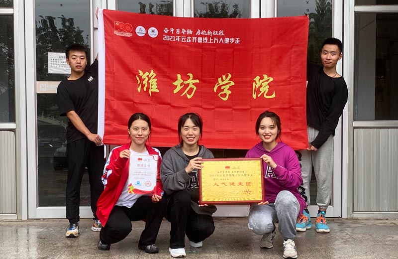 本网讯 由山东省体育局主办的“云走齐鲁,庆党华诞”100天群众性健步走活动日前结束,潍坊学院“健走团”被评为最佳“人气健走团”,团长秦志华老师被评为“最美团长”。