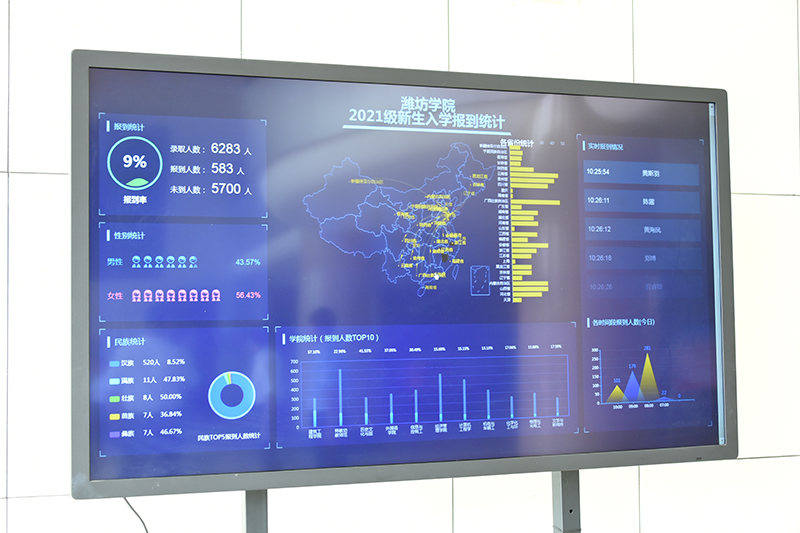 由于家长等陪同人员及车辆不能进校,为做好迎新工作,各二级学院、团委、学生工作处等都派出了数量充足的志愿者,在新生需要帮助的地方及时出现。各二级学院也都为小“21”的到来准备了各种别出心裁的迎新活动。美术学院结合建党100周年,充分发挥专业优势,在2021级新生报到第一天就切入理想信念教育,设立的“强国有我”的新生合影像框,不但让新生有耳目一新的新鲜感,更让同学们增强了做中国人的志气、骨气、底气,坚定了不负时代,不负韶华,不负党和人民期望的信心和决心;建工学院为新生设置“朋友圈”KT板进行拍照留念;“没有人永远青春,但总有人见证与守护青春”。在教师节这个特殊的日子,经管学院通过老师与新生合影的方式,表达对学生的坚守和热爱。该院还将迎新工作短视频、迎新照片同步推送,多种方式展示2021级小萌新入学的精彩片段。在学校办公楼大厅内的显示屏上,学校的迎新系统正实时显示新生报到情况,包括报到人数、占总人数比例、地域、民族、学院等信息,每30秒刷新一次。在各部门以及二级学院的协同配合下,学校迎新报到工作秩序井然、高效便捷,得到了新生和家长的一致好评。