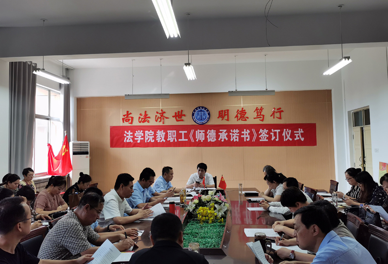 本网讯 9月16日下午,法学院举行师德教育专题学习会暨教职工《师德承诺书》签订仪式,法学院党总支书记、院长苗金春主持学习会,法学院全体教职工参加。