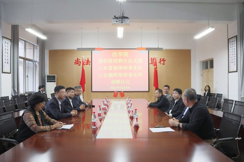 本网讯 10月9日,法学院举行兼职教授聘任仪式暨山东豪德律师事务所、山东瀚晖律师事务所捐赠仪式。山东豪德律师事务所副主任孙天锋、吕洪果和山东瀚晖律师事务所主任李建军受聘担任法学院兼职教授。法学院党总支书记、院长苗金春,原院长刘桂宗,党总支副书记曹兴波等参加聘任仪式。法学院副院长李大欣主持仪式。
