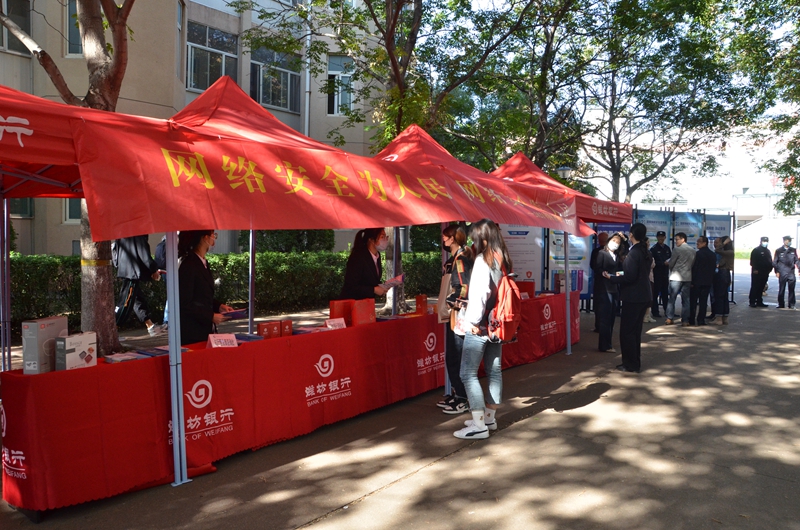 本网讯 10月12日,根据“我为群众办实事”活动安排,财务处党支部联合潍坊银行以“网络安全知识进校园,共筑安全网络墙”为主题,组织开展校园网络安全宣传活动。