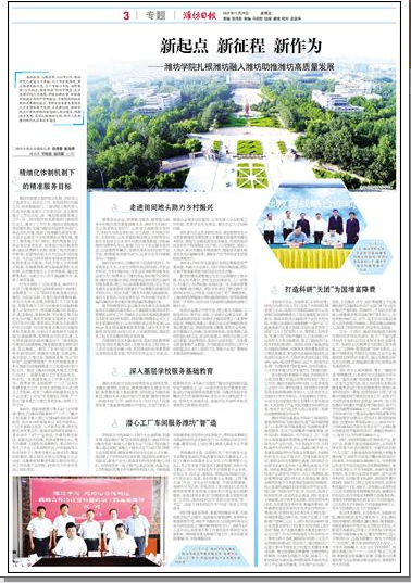 本网讯 11月26日,《潍坊日报》(三版)整版刊登了潍坊日报社全媒体记者田清春、姜海涛,通讯员毕廷延、赵风雷采写,题为《新起点 新征程 新作为——潍坊学院扎根潍坊融入潍坊助推潍坊高质量发展》的报道,介绍了我校服务地方工作的经验做法和取得的可喜成绩。http://wfrb.wfnews.com.cn/content/20211126/Articel03002TB.htm