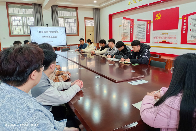 本网讯 为做好学生返校后思想状况摸排,解决学生当前在学习生活上遇到的困难,增强学院学生凝聚力,3月3日,物理与电子信息学院于明正楼5205教室举办学生代表座谈会,学院各年级各专业学生代表,辅导员王树森、商超老师参加了本次座谈会,会议由辅导员马俊原老师主持。