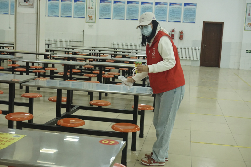 志愿者们在餐厅张贴“一米线”“间隔坐”“面向东”的标语,提前用录音喇叭录好提醒同学们戴口罩、一米线、间隔排队进入餐厅、就餐时同向朝东而坐等的提示语在餐厅入口处播放。每位志愿者都身穿志愿者服,佩戴疫情防控志愿者工作牌,不断提醒排队点餐的同学时刻保持一米间距,每个人都严格遵守。