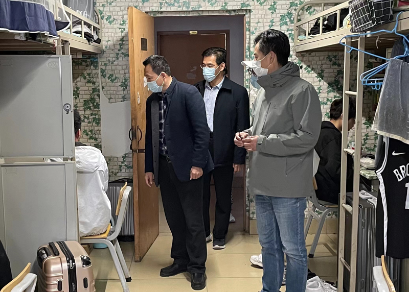 走访过程中,卢运山与同学们交流,询问学校封闭管理后大家的网课学习和生活作息情况。当听闻有时健身场所受限等问题时,表示会及时向学校反映,积极为同学们争取,在疫情防控允许的条件下加强体育锻炼,丰富课余生活。同时,也叮嘱大家一定要服从学校疫情防控大局,落实好“一日三检两报告”,注意宿舍通风和个人防护。要做好学习规划,坚持规律作息,加强体育锻炼,保持乐观心态,做到疫情防控与学业进步两不误。同学们纷纷表示,领导老师们的到来增添了战胜疫情的勇气,感受到了学校大家庭的温暖,一定不辜负学院领导的关怀,严格遵守并积极配合学校疫情防控工作。