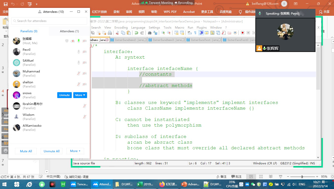 张辉辉老师担任2019级计算机科学与技术专业国际班《高级Java程序设计》授课任务,采用腾讯会议现场直播方式授课。针对Java程序设计的强实践性,先易后难、循序渐进、重点突出地剖析理论知识和技术架构,代码演示、现场动手、实时分析地展示编程实践和技术难点;考虑留学生海外学习生活特点,和学生们友好互动交流、阐述疫情学习、提高防控意识、增强学习氛围、改善学习方法、提高学习效率,广受留学生好评。