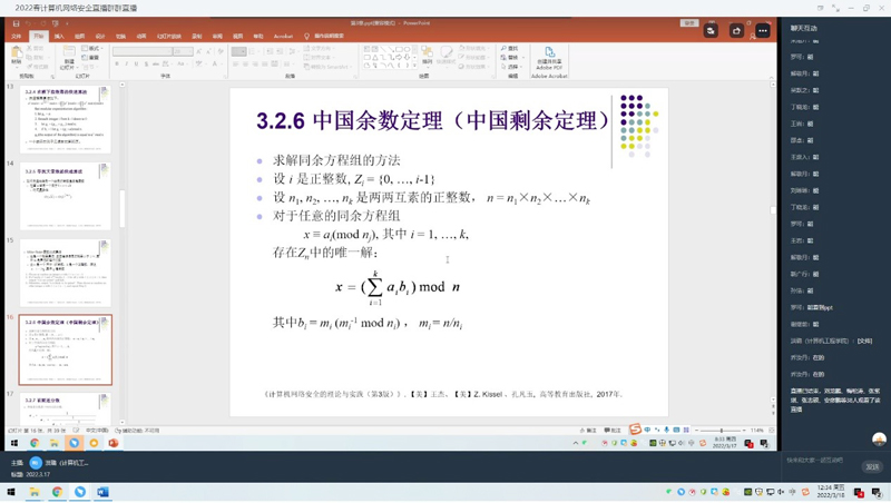 洪璐老师担任2019级网络工程1班的《计算机网络安全》授课任务。采用“学习通+钉钉直播”线上授课方式进行教学。理论联系实际,以案例教学为驱动,将较为抽象的数学知识转化为实际生活中需要解决的问题,使学生在解决问题的过程中学习其中相关联的基本理论和定理,使理论知识变得简单易懂,并通过线上练习例题巩固所学。