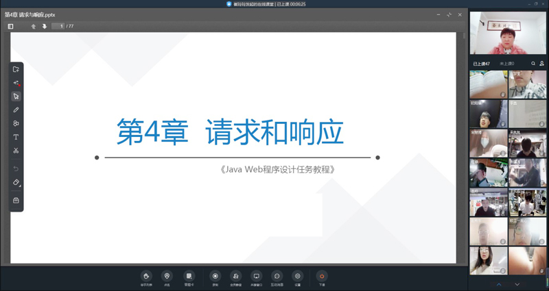 崔玲玲老师负责2020级软件工程1班《Java Web程序设计》课程教学任务,采用“智慧树共享课预习+智慧树翻转课堂直播讲解+钉钉群课后答疑”的方式授课。在讲授过程中随时用多种方式与学生线上互动,提高学生们的参与积极性并监控学生的在课状态,及时表扬表现突出的同学,让学生有成就感、获得感,提高学生学习兴趣。同时,将思政育人思想巧妙融入课堂,在课间休息时间用励志的短片、歌曲、名言等激励学生;通过网页推送让学生浏览战“疫”过程中的感人事迹,激发同学们的爱国热情和“岁月静好的背后是因为有人为你负重前行”的感恩情怀。