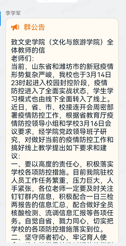 文史学院先后出台了《文史学院(文化与旅游学院)线上教学实施方案》《文史学院(文化与旅游学院)突发新冠肺炎疫情应急处置预案》,明确人员分工安排,明确线上教学规范。该院负责同志发出倡议,号召老师们创新教学形式,以高质量教学为抗击疫情贡献自己的力量。该院组建了线上教学督导群,在督导教师教学质量的同时,及时帮助老师和学生协调线上教学遇到的问题。