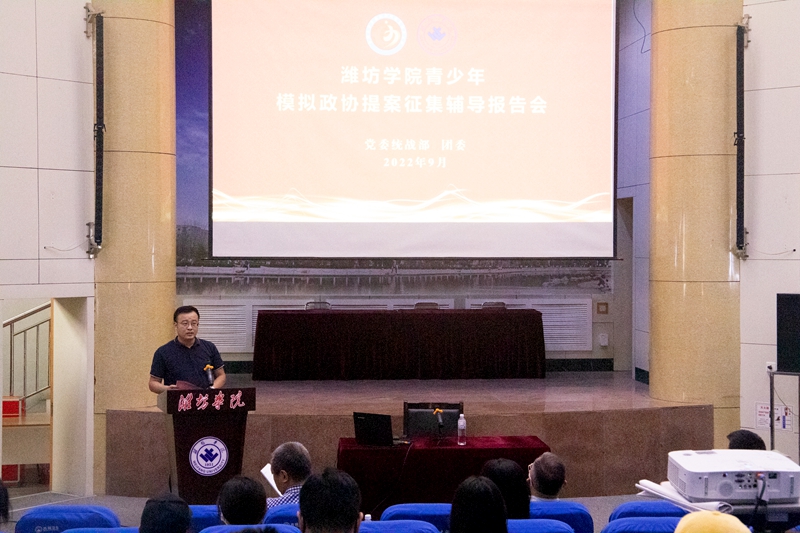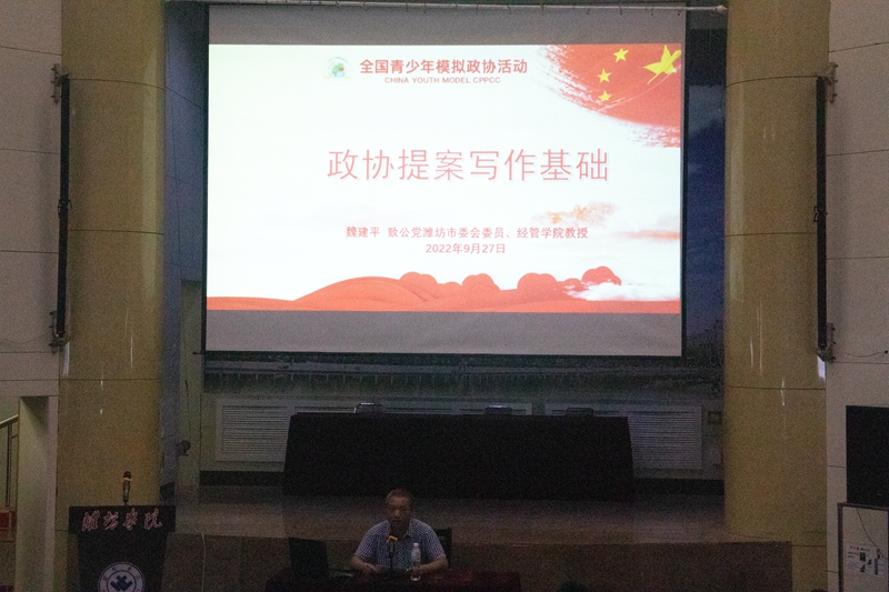 本网讯 9月27日,学校统战部与团委联合举行2022年青少年模拟政协提案征集辅导报告会。特邀潍坊市政协常委、经济管理学院魏建平教授作专题辅导,统战部、团委主要负责同志,各学院110名学生代表参加报告会。