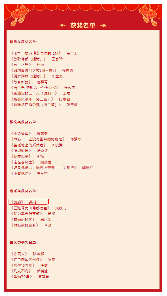本网讯 近日,由学校党委宣传部制作、我校教师吴明作词、高丽萍作曲、刘江虹演唱的音乐作品《航船》荣获潍坊市“我们的新时代”主题文艺作品音乐类优秀作品。