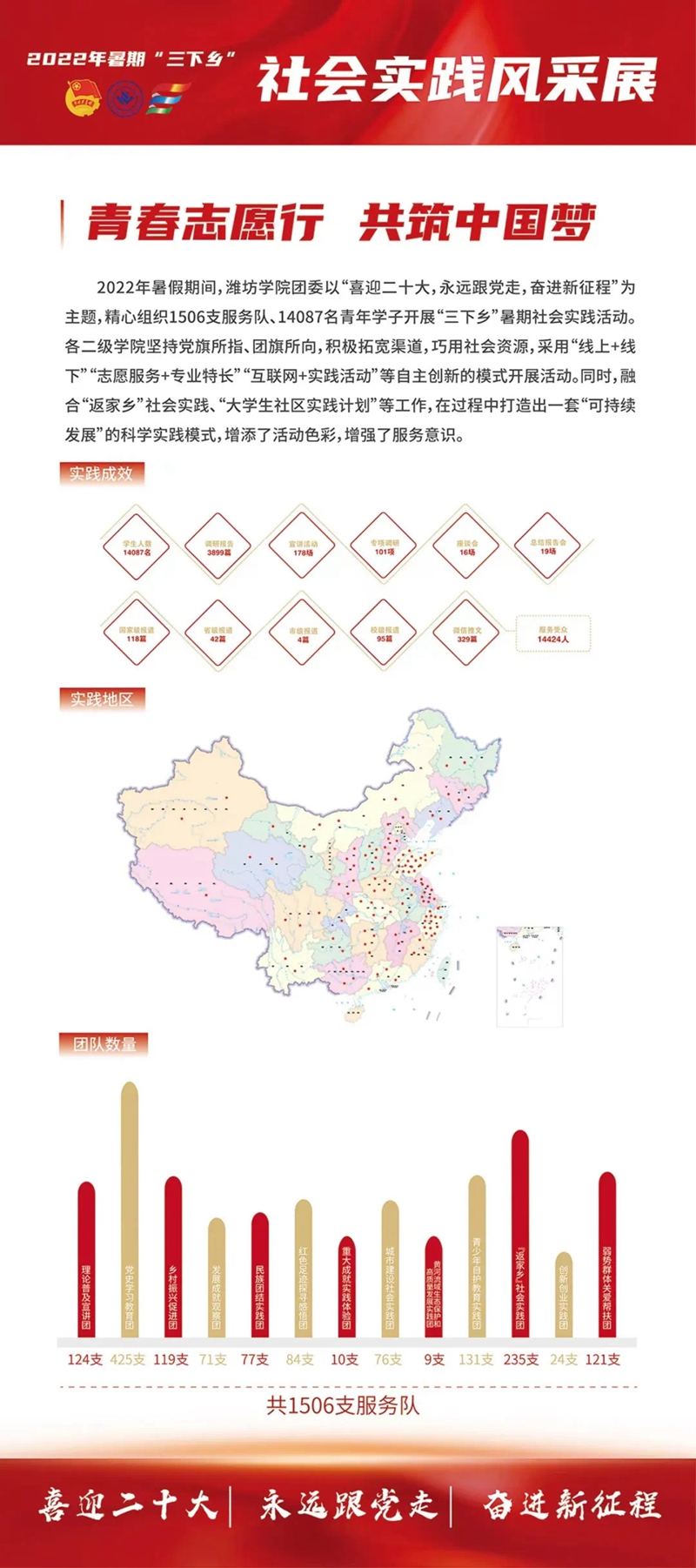 2022年暑期,学校团委积极拓宽渠道,巧用社会资源,融合“返家乡”社会实践、“大学生社区实践计划”等,共组建2支国家级重点团队,4支省级重点团队,5支团中央专项活动实践团队,以及146支校级调研实践小分队,14087名师生以集中组队实践与个人分散实践相结合的方式奔赴山东、浙江、江苏、江西、安徽等地开展了以理论普及宣讲、党史学习教育、乡村振兴促进、发展成就观察、民族团结实践等为主要内容的“三下乡”“返家乡”社会实践活动。