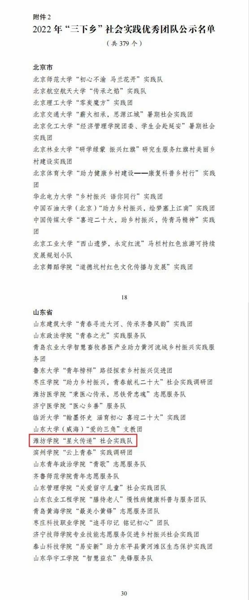 本网讯 近日,共青团中央公布了2022年全国大中专学生志愿者暑期文化科技卫生“三下乡”社会实践活动总结结果,我校“星火传递”社会实践队被授予“优秀实践团队”荣誉称号。