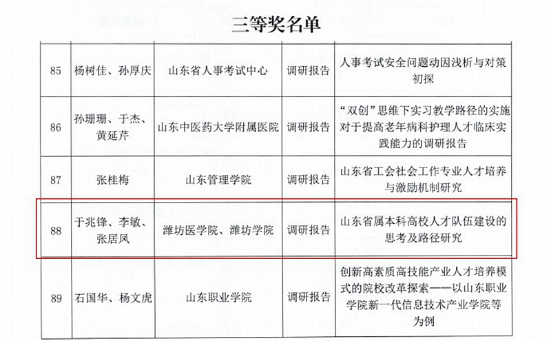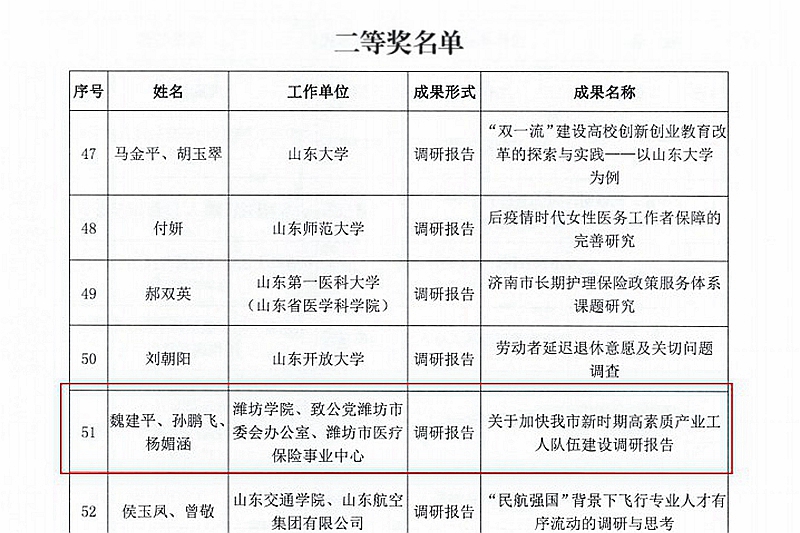 本网讯 近日,第八届(2021年度)山东省人力资源社会保障优秀科研成果名单公布,由我校魏建平老师为主撰写的调研报告《关于加快我市新时期高素质产业工人队伍建设调研报告》荣获二等奖;由我校李敏老师参与撰写,联合潍坊医学院申报的调研报告《山东省属本科高校人才队伍建设的思考及路径研究》荣获三等奖。