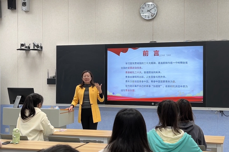 周莹首先从入党积极分子培训的重要意义和入党条件方面坚定了学员们的初心和信仰,引导学员们系好入党的第一粒扣子。课堂上,学员们回答问题积极踊跃,周莹以书本作为礼物送给大家,鼓励大家牢记共产党人的奋斗目标,努力学习,取得优异成绩。随后带领全体入党积极分子坚持原汁原味学、反复深入学、结合实际学,把党的二十大精神作为此次政治课堂的核心内容,切实把入党积极分子的思想和行动统一到党的二十大精神上来。课堂最后,周莹带领大家合诵诗歌《中国,上场》。