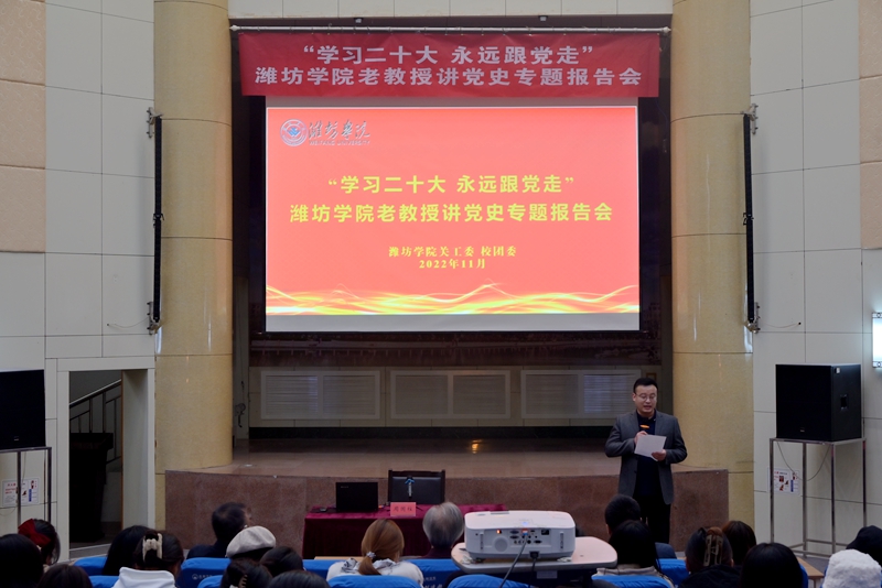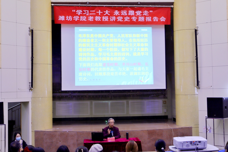 本网讯 11月10日,学校举行老教授讲党史专题报告会,报告会由学校关工委和团委主办,邀请退休老教授周国柱主讲,离退休工作处、团委负责同志和大学生诗词协会的同学们共200余人现场聆听。