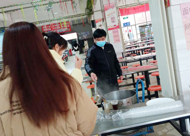 在餐厅一楼,学生服务科的老师一边帮助同学们分发免费的红糖姜汤,一边叮嘱他们要多穿衣服,不要吃生冷食物,注意保暖。