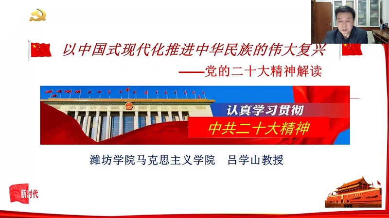 吕教授指出,党的二十大是在全党全国各族人民迈上全面建设社会主义现代化国家新征程、向第二个百年奋斗目标进军的关键时刻召开的一次十分重要的大会,是一次高举旗帜、凝聚力量、团结奋进的大会。党的二十大报告主题统摄全局,是大会的灵魂,向党内外、国内外宣示,党在新征程上举什么旗、走什么路、以什么样的精神状态、朝着什么样的目标继续前进。要深刻领会党的二十大的主题和主要成果,深刻学好党的二十大精神的“五个牢牢”,深刻领悟“两个确立”的决定性意义,坚决做到“两个维护”,对指引党和人民朝着实现第二个百年奋斗目标进军、奋力谱写新时代中国特色社会主义更加绚丽的华章,具有重大而深远的意义。