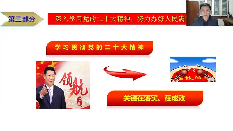 在近两个小时的宣讲中,吕教授以生动的事例、丰富的史实,从中国共产党第二十次全国代表大会主要议程及成果,党的二十大精神主要内容解读,深入学习党的二十大精神、努力办好人民满意教育三个方面作了全面深入的解读,重点突出、生动形象、内涵丰富。