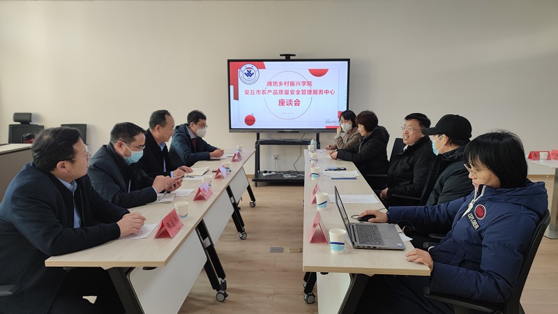 本网讯 2月3日,潍坊乡村振兴学院与安丘市农产品质量安全管理服务中心座谈会在我校举行。安丘市农产品质量安全管理服务中心、官庄镇政府领导来校,合作发展处组织校内相关乡村振兴专家参加座谈会。