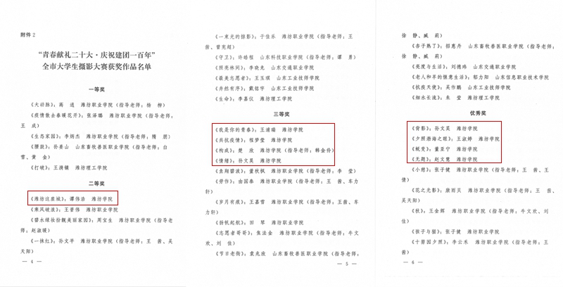 本网讯 日前,“青春献礼二十大·庆祝建团一百年”潍坊市大学生摄影大赛结果以及“版权杯”喜迎二十大潍坊市大中专学生文化创意大赛获奖名单相继公布,我校斩获多项奖项。