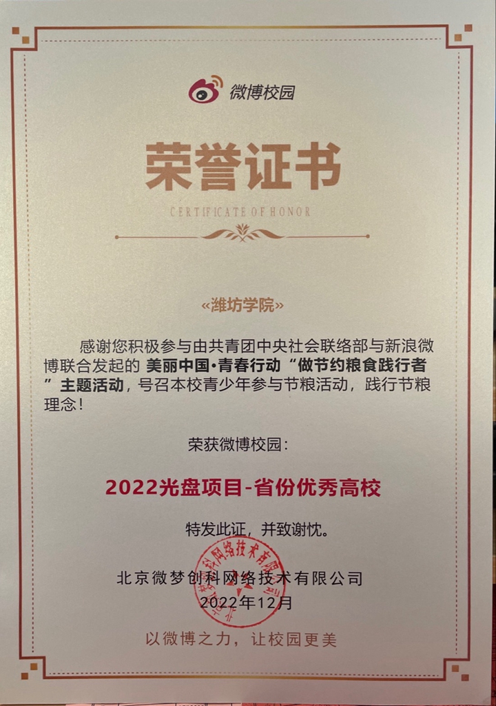 本网讯 近日,美丽中国·青春行动“做节约粮食践行者”主题活动圆满落幕,学校获得2022光盘项目——省份优秀高校。