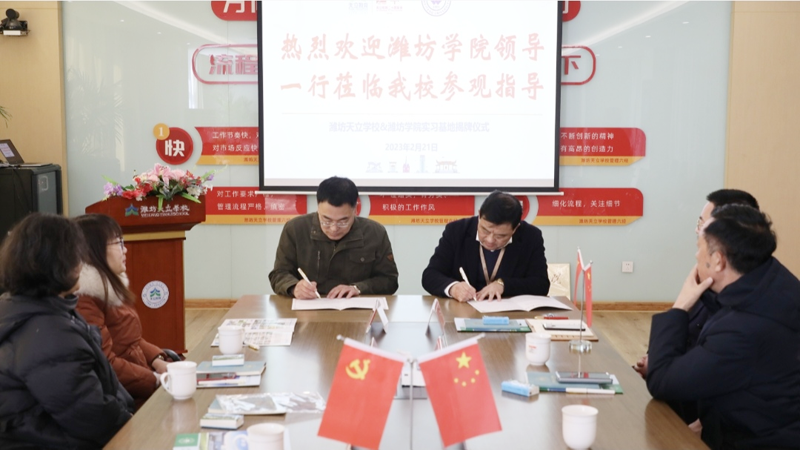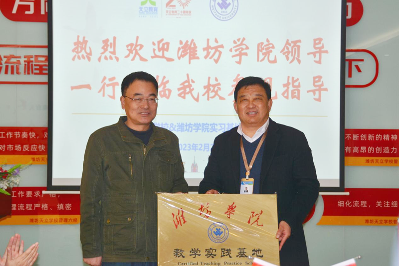 在天立学校,双方举办了签约和挂牌仪式。天立学校校长王品章对我校师生表示欢迎,对27位师范生提出了期望要求,他希望以本次教育实习为契机,与潍坊学院建立长期教学实践联系。学校教务处相关负责同志代表潍坊学院介绍了学校的基本情况以及学校未来发展思路,他希望大家把握好本次教育实习的机会,努力提升自身教育教学水平。随后双方签订了教学实践基地协议书,并举行了挂牌仪式。