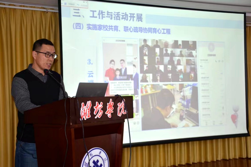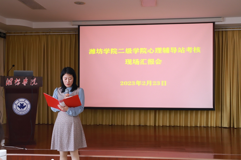 本网讯 为进一步推进二级学院心理辅导站运行的管理规范化,切实发挥二级学院心理辅导站在学生心理教育中的有效作用,2月23日,由学生工作处心理健康教育咨询中心牵头举行了二级学院心理辅导站工作考核汇报会。会议邀请了潍坊市精神卫生中心心理咨询中心周桂华主任医师、潍坊市精神卫生中心心理咨询中心主任孟亮亮、潍坊医学院学生工作处思政科大学生心理健康教育中心副科长纪莹老师担任专家评委,学生工作处处长姜廉毅、副处长赵树江、各二级学院学生工作负责人及相关老师参加了考核汇报会。